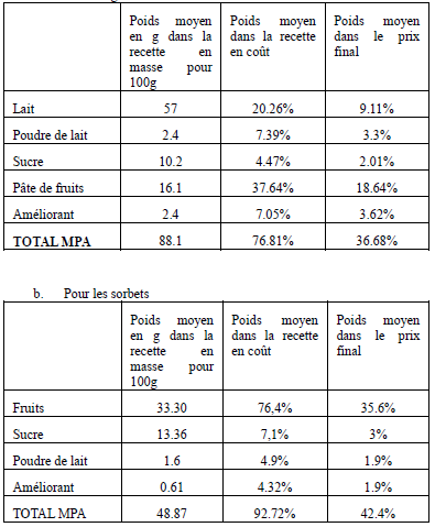 Ne disposant pas d'indicateurs pertinents pour nos approvisionnements en poudre de lait et pâtes de fruits, la révision automatique de nos prix sera réalisée en retenant, afin de construire l'indice le plus approprié, les deux matières premières agricoles majeures les plus représentatives de la composition de nos Produits, à savoir : le lait et le sucre pour les glaces, et le sucre et les fruits pour les sorbets, ainsi que leurs indices correspondants tel que précédemment cités au point II ci-dessus.